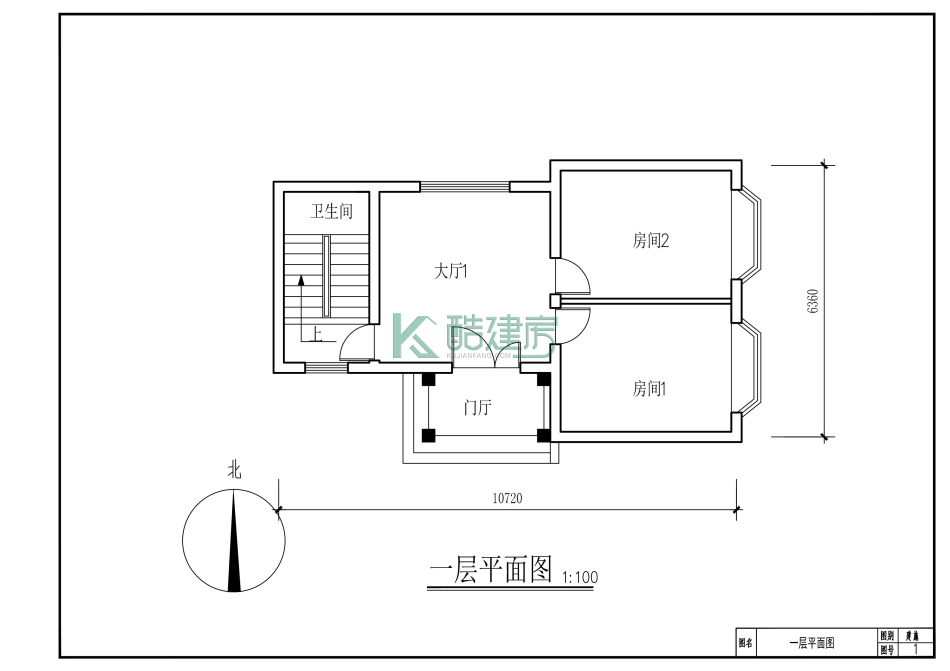 一层:卫生间,楼梯,大厅,2房间,门厅;